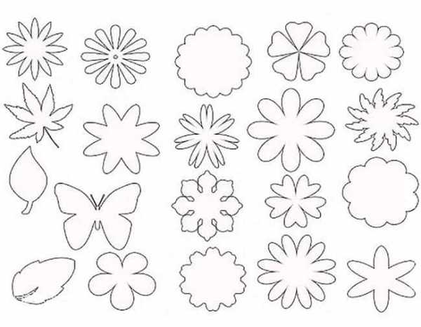 - шаблон цветка. Его нужно приготовить заранее, можно найти шаблон в Интернете там, где предлагаются схемы цветов из бумаги или сделать самостоятельно. Шаблоны – это лепестки цветка, листочки и его сердцевина по выбранным размерам.