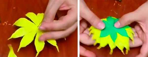 2. Теперь вырежи достаточно длинные полоски желтой гофрированной бумаги и заверни их в цветные заготовки. Закрепи поделки стиплером.