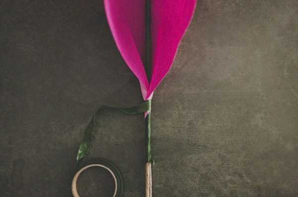 3. Склей цветок. Слегка завернув лепестки вовнутрь, придай цветку реалистичной формы. С помощью горячего клея прикрепи дротик-стебелек к цветку. Можешь изготовить стебельки из полосок зеленой бумаги и сделать оригинальную композицию на стене.