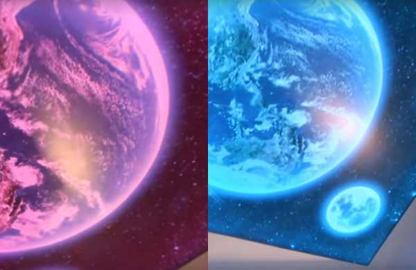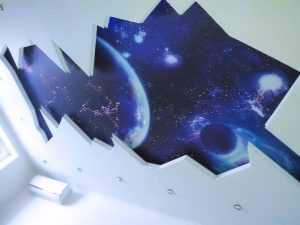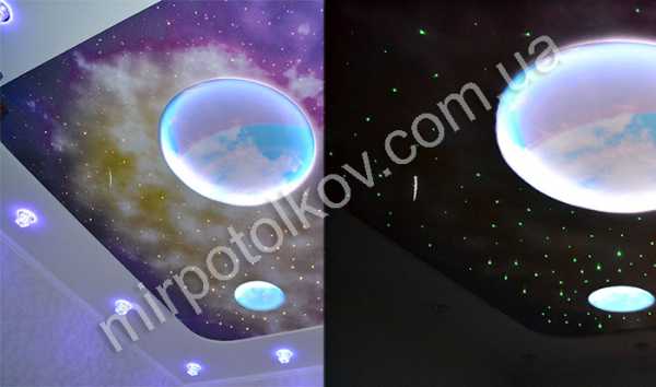 В данном случае белые точки — это сам рисунок, который напечатан на пленке, а свет исходит только от дополнительных точечных светильников. Такой способ максимально передает настроение лунной ночи со звездным небом. Это небо очень здорово поднимет настроение в спальне, после тяжелого рабочего дня. При использовании этой технологии обязательно нужно предусмотреть ночнички на стенах или на потолке, в виде настенных бра, чтобы создавать полумрак и любоваться звездами в полную силу. Так как сами звезды не будут светиться, то боковое — не основное освещение — обязательно. Можно пойти дальше, и кроме фотопечати на полотне, использовать подсветку всего потолка светодиодами. Тогда при смене цвета лед-подсветки, цвет свечения планеты и звезд будет меняться одновременно. Звезды в данном случае не будут такими четки и яркими. Ведь свет будет за пленкой и в местах более светлой фотопечати на потолке — свет будет сильнее просвечивать пленку, а в местах темных — почти не будет просвечиваться.