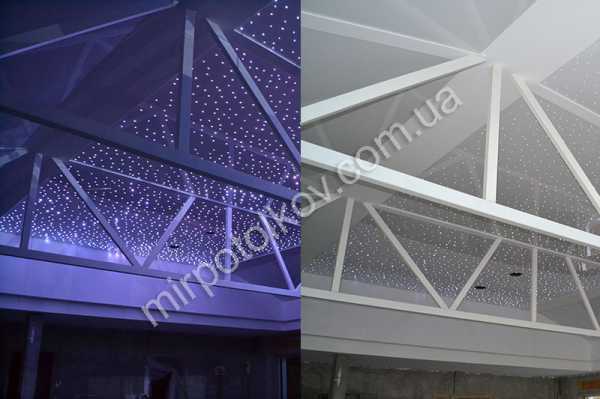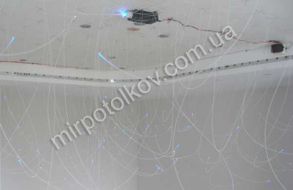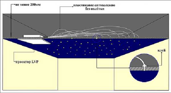 Его опускают ниже уровня проектора на 3-5 см. Проектор укрепляют на потолке в требуемом месте и производят монтаж оптических волокон на потолок. На полотно фальш-потолка наносится рисунок по трафарету.