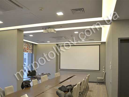 Горизонтальную плоскость натяжного потолка размечают, используя лазерный или водяной уровень. Его уровень должен быть ниже уровня проектора установленного на существующий потолок. По отмеченным линиям крепят багет (пристенный профиль натяжного потолка).