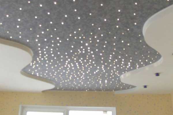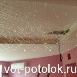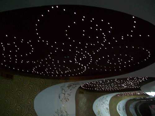 Во втором способе полотно прокалывается. В натяжном потолке создаются отверстия, через которые протягиваются оптоволоконные нити (по отдельности или пучками). Их подклеивают с изнаночной стороны, а снаружи подрезают — ровно по поверхности или, позволяя выступать на 1-2 миллиметра. Когда проектор включается, свет проводится по всей протяженности оптоволоконных нитей, и поверхность потолка начинает светиться сотнями небольших огоньков. Как это выглядит, посмотреть можно на фото.
