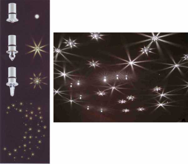 В случае, когда монтируется натяжной потолок небо в звездах, источником света выступает специальный проектор, установленный на существующем потолочном перекрытии. К нему подключен пучок светопроводных оптических волокон. Для этого применяется специальная насадка.