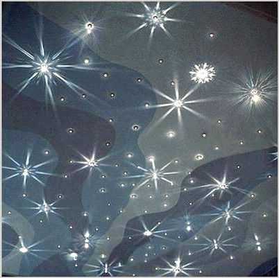 Иллюминация с использованием оптоволокна и хрустальных рассеивателей Swarovski, тоже звездное небо. Потолки выполняют опять же при помощи оптоволоконного светогенератора и оптоволокна, которое выводят сквозь пленку (это тот вариант, что с «проколом пленки») На лицевой стороне пленки на оптоволокно одевают специальный рассеиватель Swarovski, который собственно и эмитирует звезду и создает уникальное звездное небо дома, в ресторане, в клубе.