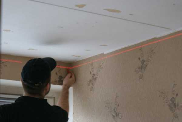 - Необходимо измерить высоту помещения. Важно учесть параметры светогенератора. На поверхности стены необходимо провести линию, которая обозначит местоположение будущего подвесного потолка.