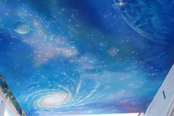 Первый вариант звездного неба — это натяжной потолок с нанесенным на него графическим изображением, является самым простым и очень красивым решением. В этом случае на матовой пленке наносится реальное фото звездного неба или галактики высокого качества.