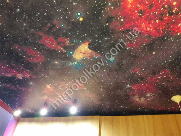Третий вариант звездного потолка, в котором сочетаются элементы первого и второго варианта. Это использование фотопечати звезд и оптоволоконных нитей по всей плоскости натяжного потолка. Какой будет визуальный эффект, представьте сами, просто включив воображение. Тут можно свою фантазию дополнить еще и падением двух, трех комет. Правда такая работа требует невероятной аккуратности и профессионализма, но я с удовольствием берусь за такую работу, потому как это не просто потолок, а настоящее произведение искусства.