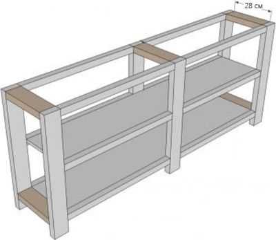 - Из деревянного бруса – 50*50, 20*20 мм, нарезают перекладины и крестовины. Последние нужны при большой длине тумбы – более 1,2 м;