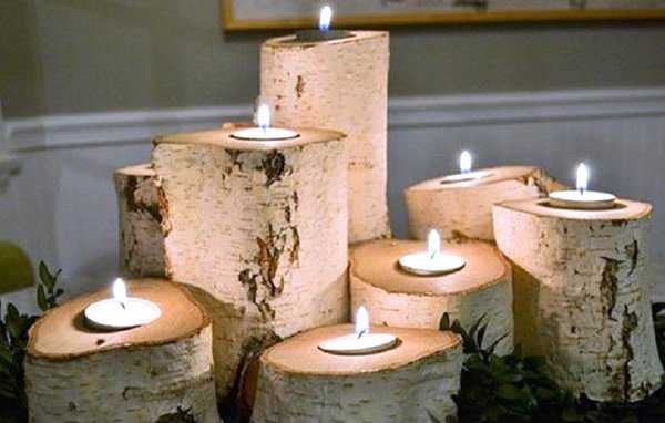 Толстую ветку можно и не распиливать, а сделать из нее подставку для нескольких свечей. Для этого нужно положить ее горизонтально и по всей длине сделать несколько углублений для небольших свечей. Такая подставка будет идеальным украшением для стола, а также замечательно будет смотреться над камином.