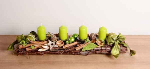 Имеется в виду, что можно использовать все производные дерева и все, что с ним связано и может его напоминать. Например, крупную широкую свечу можно оформить небольшими шишками, закрепив непосредственно на самой свече. Или шишками можно оформить сосуд, в котором размещена свеча.