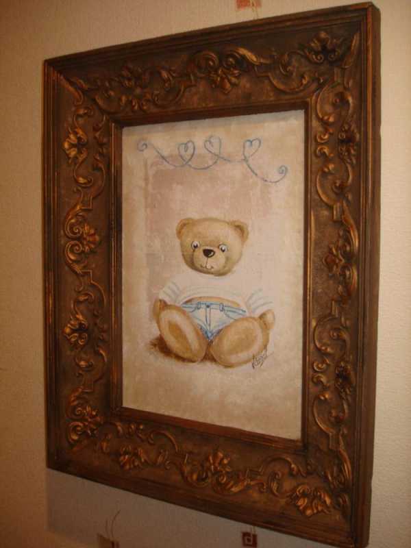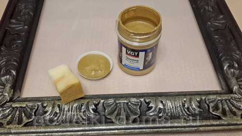 10.После высыхания краски наносим губкой эмаль с эффектом металлик (позолота, бронза или серебро) на выпуклые части рисунка рамы.