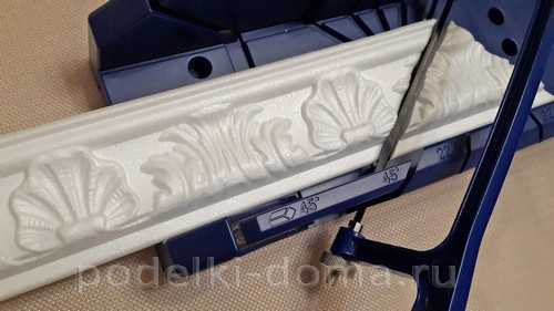 - Режем галтель с помощью ножовки, учитывая, что отложенные отрезки являются внутренней частью будущей рамы. При этом необходимо выполнить срезы под углом в 45 градусов, чтобы все фрагменты затем сложились в ровный и аккуратный прямоугольник. Для этого и используется стусло, представляющее собой коробочку без торцевых стенок со специальными прорезями под ход пилы;