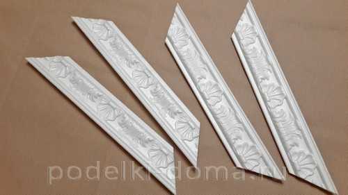3. Потолочный плинтус разрежьте на 4 отреза, которые будут по размеру соответствовать вырезанному каркасу. Будьте внимательны и аккуратны, плинтус изготовлен из достаточно хрупкого пенопласта. Разрезать следует острым ножом на ровной поверхности, не надавливая сильно на поверхность плинтуса.