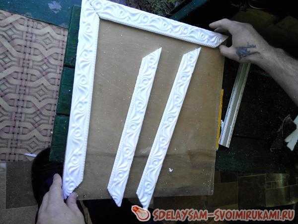 Легче всего изготовить рамку используя при этом потолочный плинтус или настенный молдинг из пенопласта, так как этот материал наиболее легок в обработке.