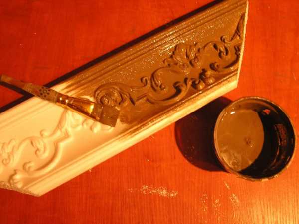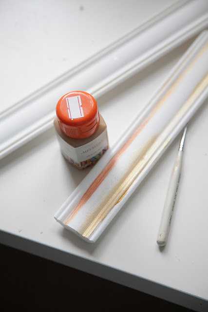 7. Приступаем к молдингу. Он был распилен под углами как под багет. Покрываем обильно его акриловой краской.