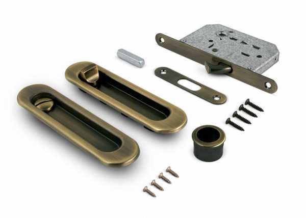 Из-за своей необычной конструкции для раздвижных дверей требуется фурнитура определенного типа. Замки и ручки для раздвижных дверей не такие, как мы привыкли видеть на обычных дверях. Характерной чертой ручек является то, что они утоплены в дверное полотно. Делается это для того, чтобы двери могли беспрепятственно отъезжать в сторону и при необходимости заезжать в отведенную для неё нишу. Замки также не совсем обычные. Если сравнить с привычным замком, то можно увидеть, что замковый механизм создан для вертикального защелкивания.