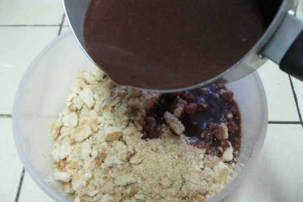 - Яйцо взбиваем вилкой, вливаем к получившейся шоколадной массе, а затем ее переливаем к раскрошенному печенью.