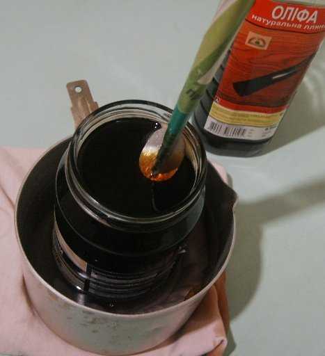 Деталь окунается в масло. С этой задачей отлично справится льняное масло.