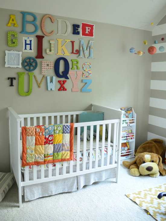 оформление стены детской комнаты буквами алфавита различной формы и размеров