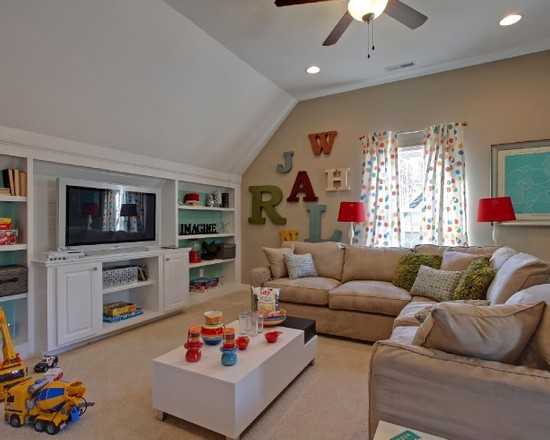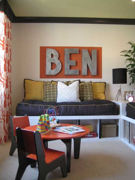 Очень часто западные интерьеры встречают надписями имен. Еще Карнеги подметил, что приятнейшим сочетанием звуков для человеческого уха является его имя. Это активно используют американские учителя. Поощряя ребенка, его непременно называют по имени. Этот ход формирует положительное восприятие своего имени. Родители же в свою очередь дополняют педагогические приемы размещением в детской букв на стене, составляя из них именную композицию.