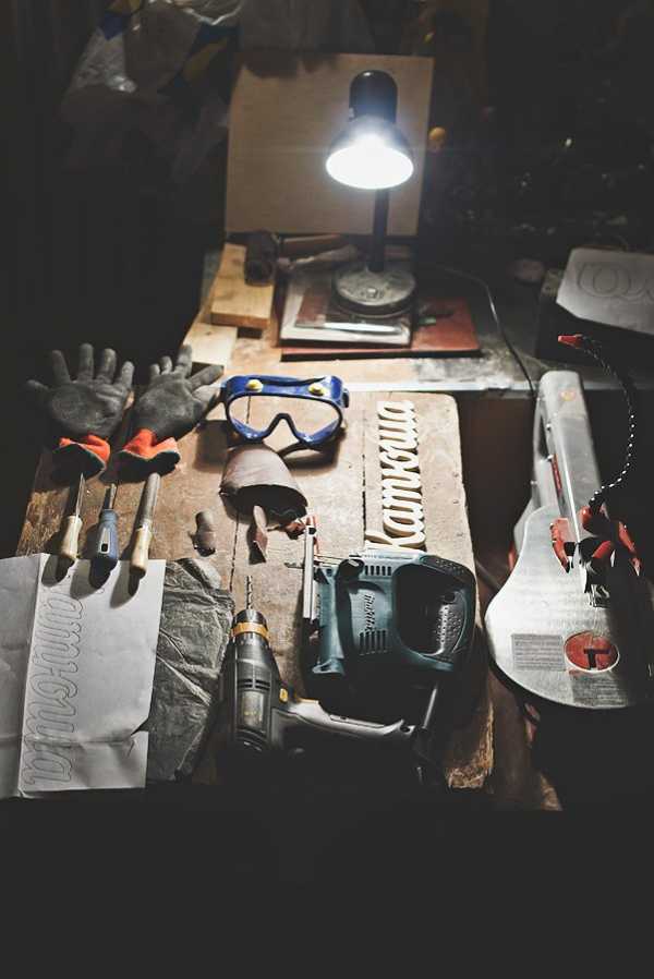 - Удобные инструменты для выпиливания букв. Выбор инструментов может быть очень широк — некоторые предпочитают вырезать лобзиком, кто-то использует электроинструмент. Если вы захотите придать фактурности вашему изделию после вырезания, то вам пригодится набор ножей и стамесок для резьбы по дереву.