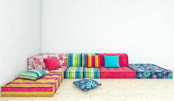 Стиль бохо отличается разнообразием ярких разноцветных подушек
