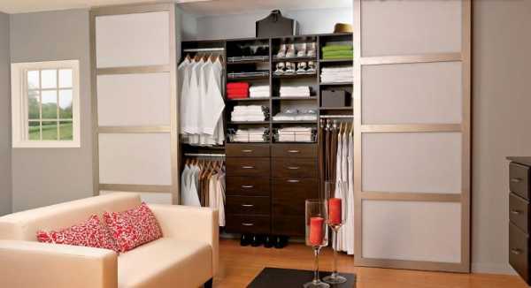 Раздвижные двери – купе в конструкции гардеробной.Здесь так же имеется несколько вариантов: их можно установить на всю ширину проема или частями. Части, которые не принимают участия в работе дверей, так же должны быть использованы, ведь места и так не хватает.
