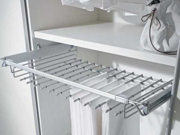 Один из дешевых вариантов хранения юбок и брюк.Для хранения галстуков так же предусмотрена особая конструкция, которая выдвигается в длину. Хотя, существует и другая система, которая ориентирована на хранение в ячейках ящика.