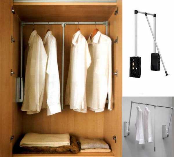Выдвижные кронштейны для хранения одежды.Еще одна, но очень интересная конструкция – это пантограф. Он позволяет использовать полезное пространство вплоть до самого потолка, не оказывая влияния на функциональность. Причем, крепиться устройство может как к боковым стенам, так и к самому потолку. По центру трубы установлена специальная штанга, движение которой опускает предметы в горизонтальное положение. Как правило, грузоподъемность подобных устройств не превышает 18-ти кг, что соответствует легкой по весу одежде.