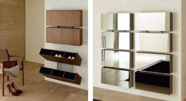 Использование мини-комодов, расположенных на стене.Это не все идеи, так как их огромное множество. Они позволяют хранить обувь компактно, практически не занимая много места. С ними можно познакомиться на фото ниже.
