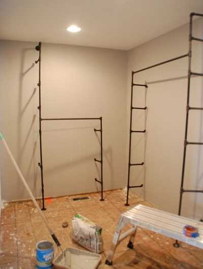Устройство гардеробной из круглой мебельной трубы.Оборудование для хранения одежды