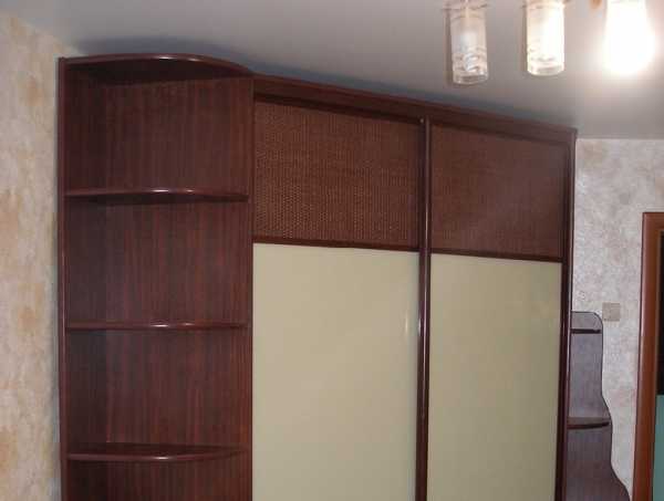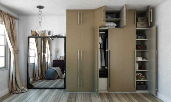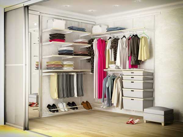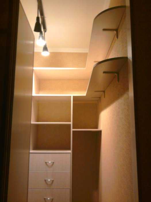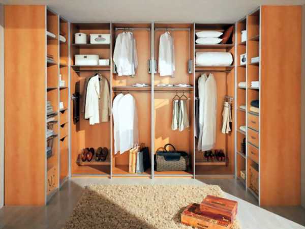 Гардеробная комната, расположенная в углу.Если площадь не позволяет, то придется несколько увеличить ее искусственно, делая стены не ровными, а с выдвинутой вовнутрь серединой. Площадь комнаты от этого не пострадает, а вот в этом месте можно реально вместить огромное множество полезных вещей.