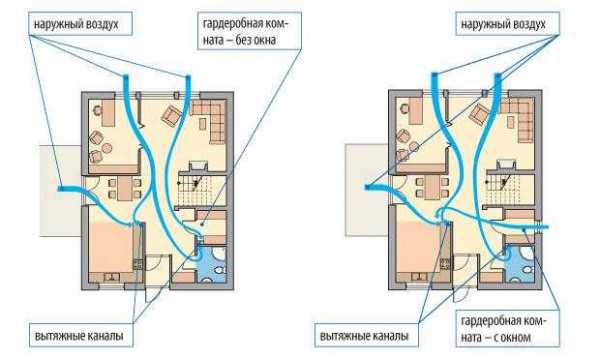 Варианты организации вентиляции в гардеробных, через ванную комнату.Выбирая вентилятор (если это принудительная система) следует обращать внимание на его уровень шумов. Дело в том, что место под гардеробную, может быть выделено в спальне или рядом с ней. Поэтому, лишние шумы абсолютно ни к чему. Включается вентилятор либо автоматически, либо с помощью обычного сетевого выключателя.