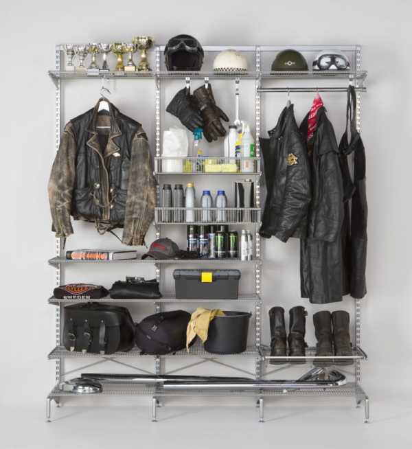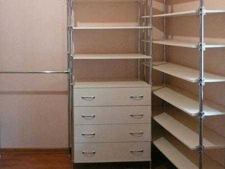 Классическая мебель занимает значительное пространство.В таком случае прибегают к более современным подходам, применяя для этого легкие металлические системы хранения. Это модульные конструкции, которые монтируются на специальных стойках. Они могут крепиться по-разному, в зависимости от условий их использования: или к потолку и к полу, или к стенам. Разные производители выпускают различные системы, которые могут отличаться и способами крепления. После установки стоек, на них навешивают все, что необходимо для хранения.