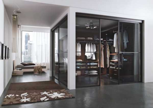 - Главное – удобный доступ. Кроме обычной межкомнатной двери (распашной, скрытой, раздвижной), многие используют в отдельных гардеробных популярные двери-купе – те, что имеют направляющие наверху и внизу. Помните, что дверь-купе не сможет обеспечить полную защиту от пыли. Можно поставить раздвижные или распашные перегородки, состоящие из нескольких полотен. Такая система обеспечит максимально широкий проход.