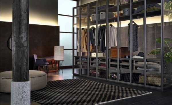 - Функциональный куб. В просторной спальне можно выстроить отдельную зону, которая огорожена ненесущими конструкциями. Строят «гардеробный куб» с помощью металлических уголков и профилей – из стеновых панелей, из МДФ или гипсокартона. Нередко для возведения таких «комнат в комнате» используется пласт-стекло (PLEXIGLAS®) или обычное стекло (закаленное либо триплекс) – прозрачные стены пропускают естественный свет в гардеробную.