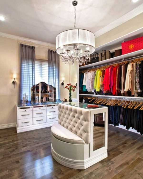 - Яркое освещение. Зеркало, пуф и туалетный столик в гардеробной – предметы опциональные, а вот хорошее освещение внутри этой комнаты (или даже шкафа) должно быть обязательно. Используйте точечные светильники и лампы направленного света.