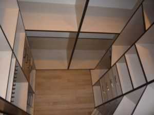 Что касается освещения, то оно должно быть ярким. Во-первых, нужно быстро находить нужные вещи, а во-вторых, цвет вещей должен быть реальным. Если освещенности мало, то и цвет вещей такой же туманный и не естественный, после чего можно спутать некоторые вещи, которые имеют схожий рисунок и расцветку. К тому же, одевая на себя белье или одежду, следует реально оценить их гармоничное сочетание. При этом, свет должен равномерно распространяться по всей гардеробной. Зеркало может располагаться на двери или же сами двери могут быть зеркальными.