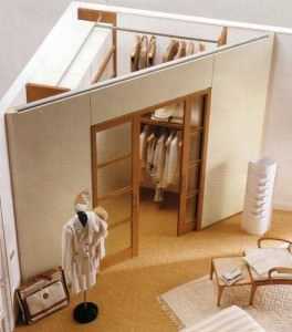 Гардеробная комната в мансарде, где используется ее боковая часть.Раздвижные двери по всей ширине, чтобы проще добраться до вещей.