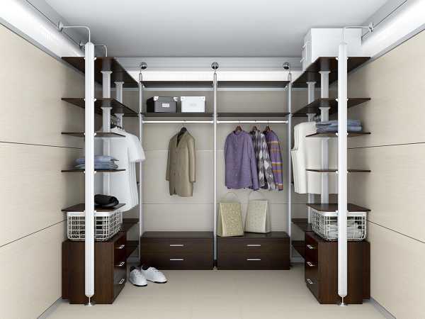 - Типовые металлоконструкции. Из них «начинка» гардеробной собирается играючи. Несущие рельсы, кронштейны, полки, вешала и проволочные корзины продаются во всех мебельных гипермаркетах за небольшие деньги. Такую систему легко менять по своему вкусу и требованиям.