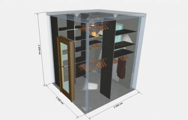 Небольшие гардеробные с размерами: 1,5х2,5 м и 2х2 м.Мини-гардеробная в виде прямоугольника, когда вещи располагаются по одну сторону, должна иметь ширину, не меньше 1,2 метра, а при двустороннем хранении – не меньше 1,5 метра. Кроме этого, еще должно оставаться место для человека, который не просто разглядывает шкафы, а одевается или раздевается. Поэтому, гардеробные кардинально отличаются от шкафов-купе. Плюс ко всему, в гардеробной должно быть столько пространства, чтобы можно было установить любые двери.