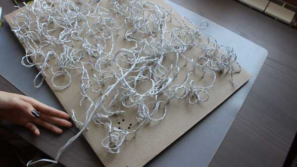 Однако мои дырочки все равно малы для лампочек, поэтому я проткнула уже именно лампочками картон. На изображении показано, как я вставляю гирлянду, но в дальнейшем я стала это делать одной и той же лампочкой, так получается быстрее. Вы спросите, зачем проделывать двойную работу и два раза увеличивать дырки, когда это можно сделать за один раз чем-то толстым. Да, но протыкая лампочками, мы получаем именно тот размер, который будет подходить под них, и они будут плотно сидеть.