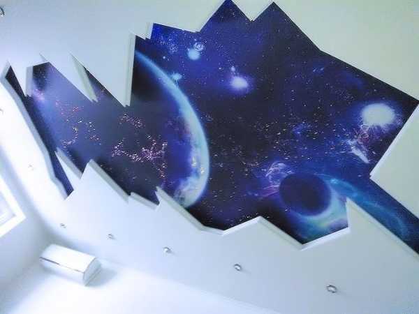 - Навесные потолки из плёнки ПВХ применяют наиболее часто, так как на них проще всего наносится фотопечать. По структуре плёнка может быть глянцевой или матовой. Наибольшей популярностью пользуются полотна, на которые с помощью фотопечати наносят рисунки с изображением космоса.