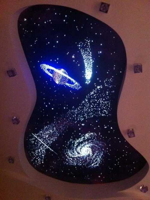 Сделав дома своими руками натяжной потолок звездное небо, можно будет наблюдать полет комет, рождение звезд, мерцание млечного пути и другие явления каждую свободную минуту отдыха. Космический дизайн не только развлечет, удивит, но и, при соответствующей программе контроллера, успокоит, расслабит, позволит отрешиться от проблем или настроит на романтический лад.