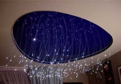 Вариант, когда оптоволоконные нити не укорачивают, а вытягивают на 10 — 100 см позволяет создавать дополнительные эффекты. В дополнение к оптоволоконной технике можно использовать светодиоды, которые крепят к фальш-потолку или выводят на поверхность полотна. Они управляются программируемым контроллером.