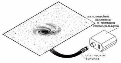 Проектор или светогенератор служит световым источником, его прячут под навесным потолком или за мебелью, а иногда и в другой комнате. Если проектор устанавливают под полотном, то лучи нужно направлять параллельно ему и перпендикулярно оптоволоконным нитям.