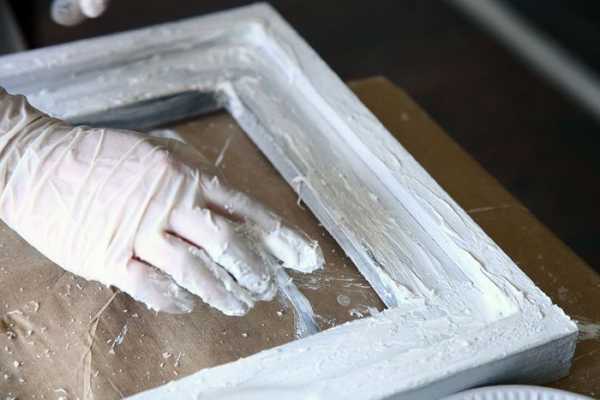 Шпатлевка – замечательная вещь. Ей не только можно замазать вмятины от саморезов, лишние трещинки и прочее. Ей можно еще и создавать объем и фактуру, добиться рельефности и такого эффекта, будто на вещь уже наложили десяток слоев плотной краски. Именно на этом этапе мы поняли, зачем нам фартуки и медицинские перчатки (а также бахилы): наносить шпатлевку проще всего оказалось пальцами, так что даже самые аккуратные не остались бы чистыми.
