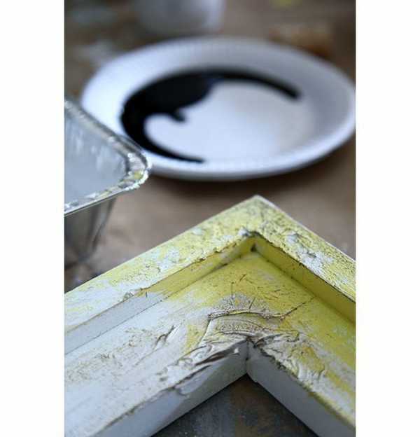 - Шаг 5: Третий слой краски Повторите шаги 2 и 3, но последний уже с использованием краски другого цвета (здесь это будет желтый). После того, как краска высохнет, можно нанести защитный лак. Последнее не обязательно в силу того, что мы специально придавали старинный вид, так что если краска со временем начнет немного отставать этого не будет заметно.