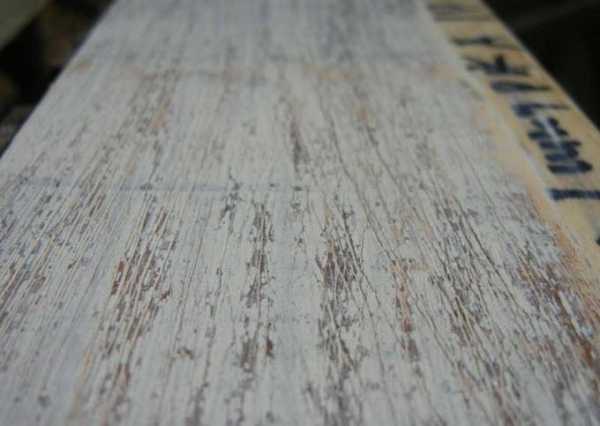 Упрощенный до минимума вариант – использование металлической щетки и белой глазури. Проходимся по поверхности щеткой, покрываем ее белой глазурью и опять после высыхания счесываем толстые участки с отделкой щеткой. Благодаря такому простому методу старения дерева получается побеленная доска с легким многолетним налетом.